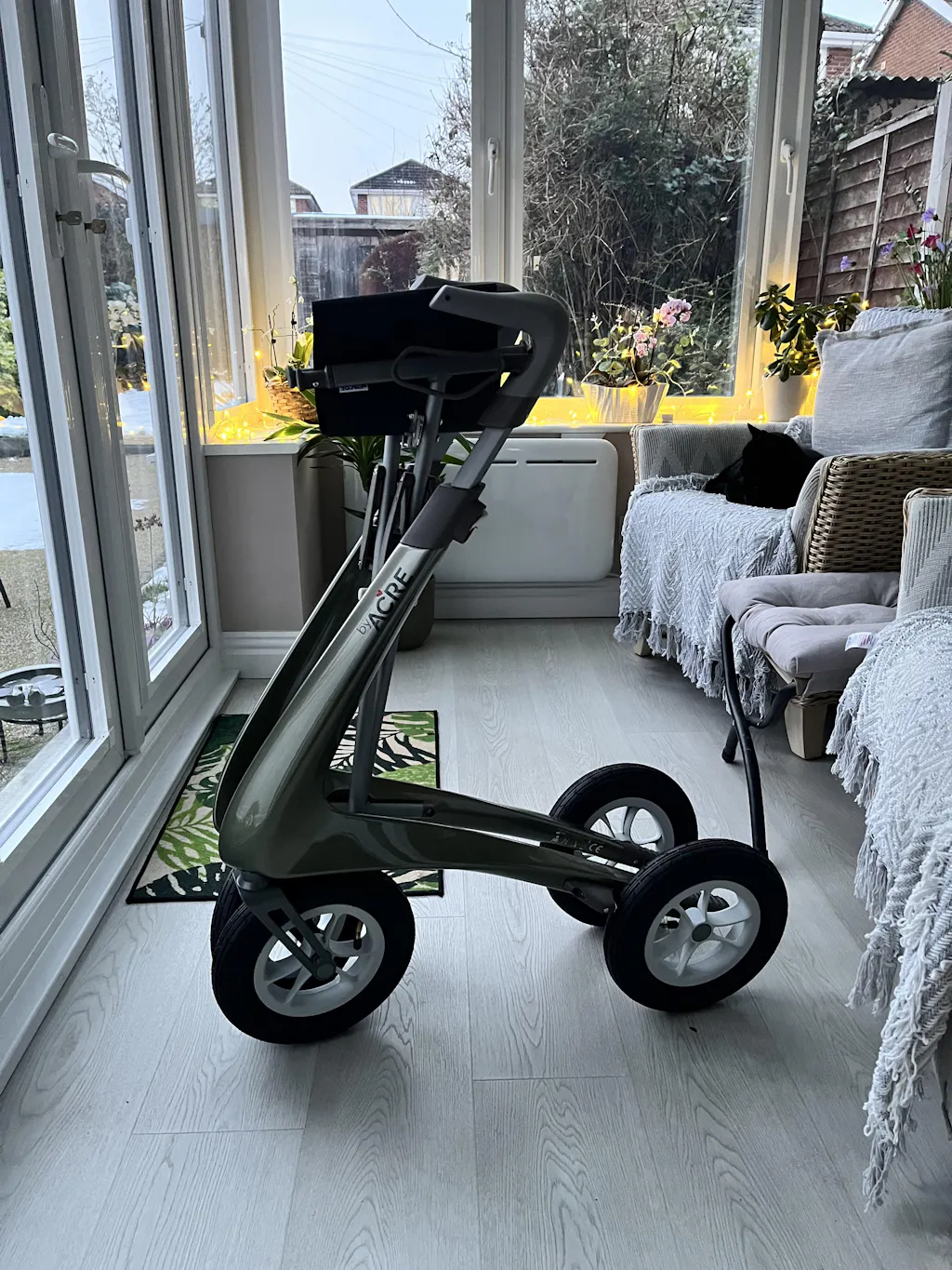 I have deteriorating disc problems and although I can walk well, it was getting increasingly difficult to walk the same distances I could a month or so ago. I was forever sitting down on wet dirty walls or seats to give my back ‘a break’. I bought the Overland as I’m off road a lot with my dog, I needed a Rollator that could handle rough surfaces, mud and the beach.